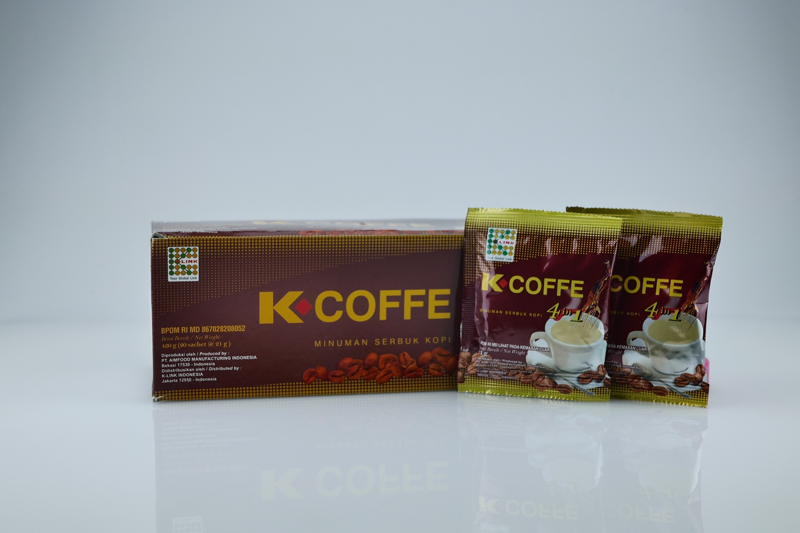 Kopi + Gula + Krimer + Gingseng Minuman kesehatan yang mengandung biji kopi Arabica dengan kualitas tinggi yang dipadukan dengan ekstrak ginseng dengan aroma yang menyegarkan dan baik untuk kesehatan. K-Coffe 4 in 1 bermanfaat untuk meningkatkan stamina, konsentrasi kerja dan sistem kekebalan tubuh.